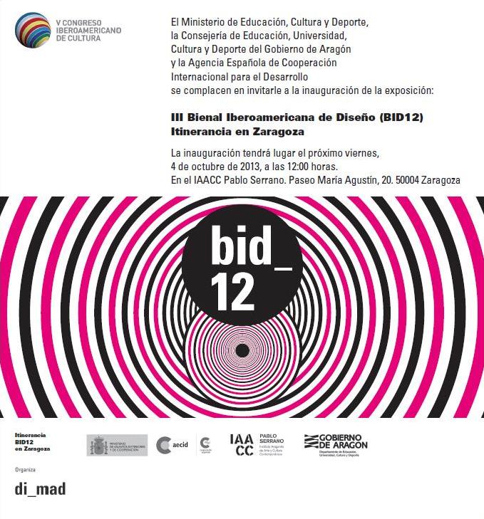 El 4 de octubre a las 12.00 h., se inaugura en la Sala 00 del IAACC Pablo Serrano la exposción "BID_12. III Bienal Internacional de Diseño". Muestra que se pudo ver este año en la central Diseño de Matadero Madrid, y que se desarrolla dentro del marco del V Congreso Iberoamericano de Cultura.