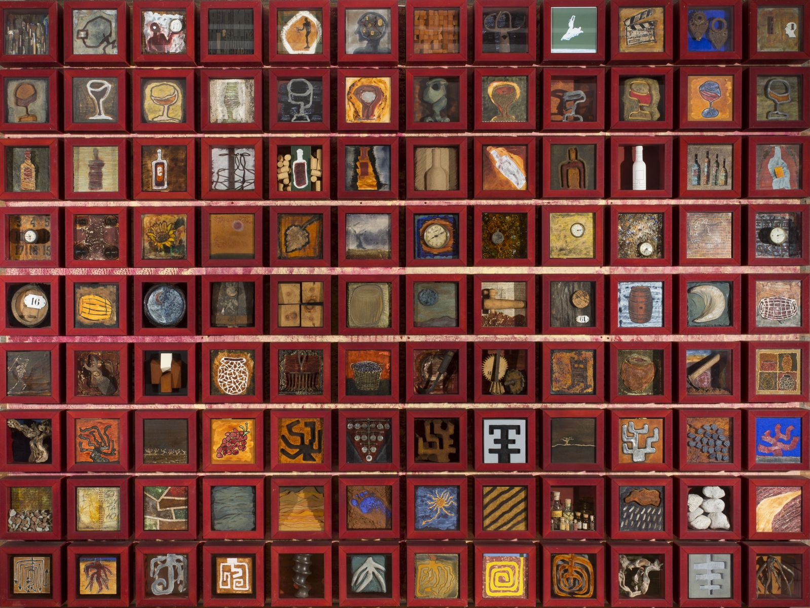 La exposición Arte y vino. Colección ENATE presenta un total de 43 obras de pintores de reconocido prestigio cuya obra ha servido de etiqueta distintiva de cada uno de sus vinos.