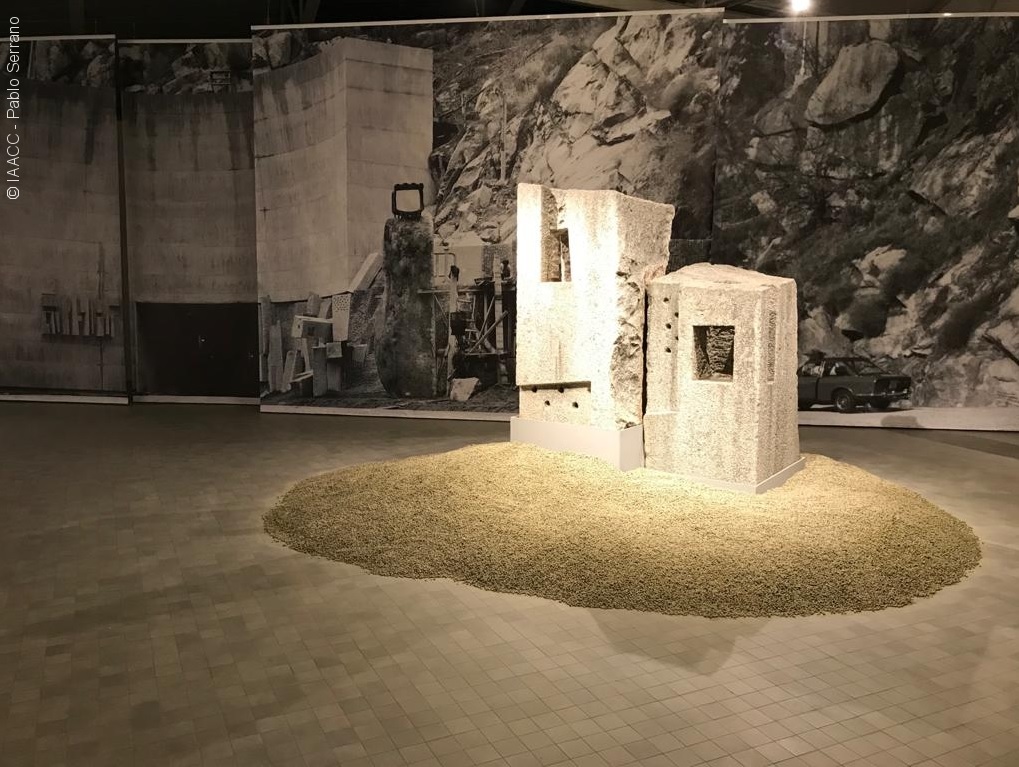 La exposición está conformada por una serie de dispositivos museísticos, piezas que reconocemos, a primera vista, como elementos constructivos, arquitectónicos y con una carga monumental y clásica. Piedras, sillares, cornisas, se exhiben siguiendo una lógica aparente, tanto arquitectónica como de orden cromático y de tamaño. Para ello, el artista retoma los mecanismos de exhibición utilizados por la museología arqueológica y que otorgan una entidad rotunda al pasado. Recurre, por un lado, a las tipologías de display donde los restos quedan estrechamente vinculados entre sí siguiendo un criterio de ordenación espacial y semántica. Por otro, utiliza el fake como herramienta formal y conceptual –partes de carpintería sin valor histórico, tales como molduras de ventana, restos de puertas… a los que se ha sacado un molde y realizado reproducciones. Sin embargo, todas estas piezas son un fake con el que se pretende seducir al espectador y hacerle creer que esas reconstrucciones de imágenes son reales.