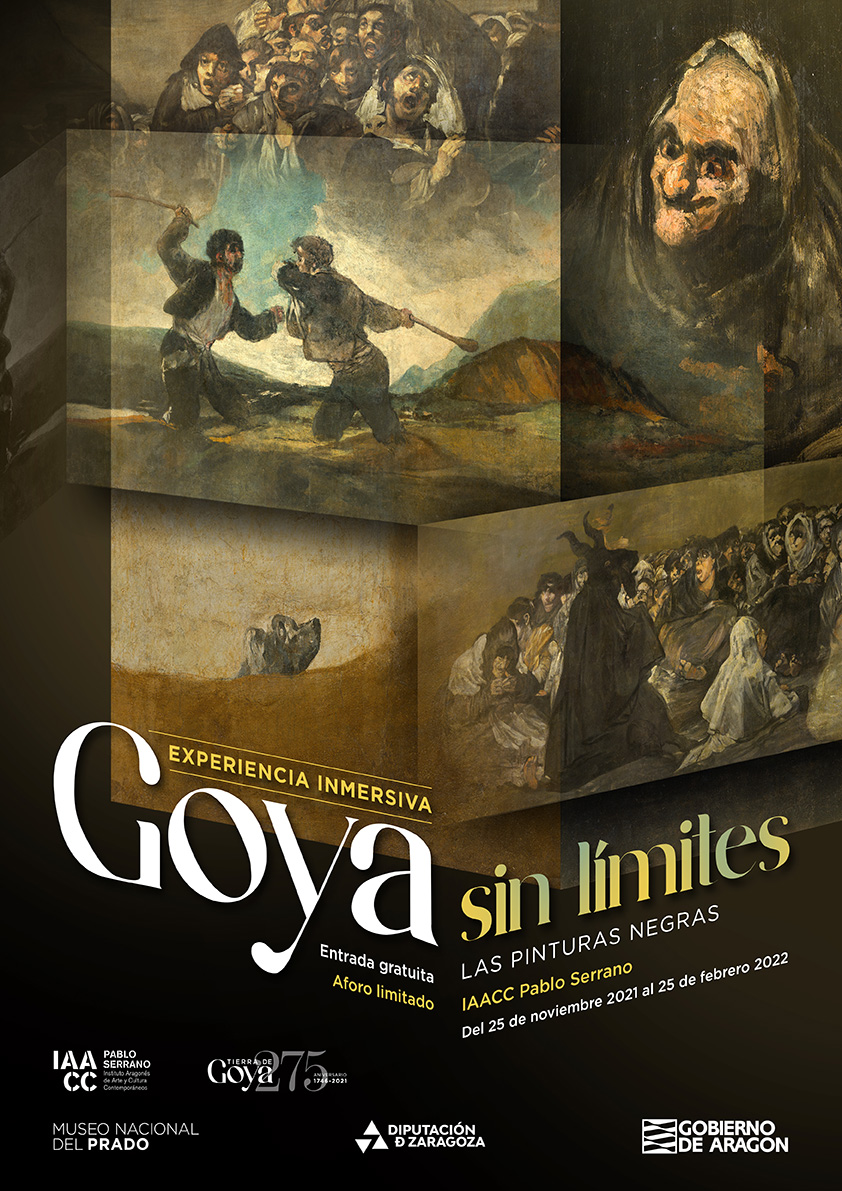El auditorio del IAACC Pablo Serrano se convierte en una caja oscura donde se realiza una proyección de 360 grados, en la que los visitantes van a poder disfrutar de una experiencia de inmersión en las Pinturas Negras de Goya, a partir de las imágenes cedidas para este proyecto por el Museo del Prado.